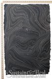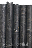Dark charcoal base sheet gives a “black on black” effect with black marbling. Natural deckle edge and metallic silver and gold highlights. Text weight works well for folding, wrapping, envelope liners and much more. For applications needing a thicker 110lb cardstock weight select Cover Stock.