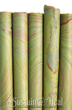 Sage Green base sheet. Red and yellow-green marbling with metallic gold highlights. A modern take on Christmas color. Text weight works well for folding, wrapping, envelope liners and much more. For applications needing a thicker 110lb cardstock weight select Cover Stock.