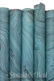 Teal base sheet with natural deckle edge. Black and charcoal marbling with metallic gold highlights. Rich and vibrant color. Text weight works well for folding, wrapping, envelope liners and much more. For applications needing a thicker 110lb cardstock weight select Cover Stock.