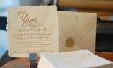 One color letterpress printed on 6x6" handmade 100% recycled Perennial Paper. Embedded leaf skeletons add a natural antique look and feel. Average cost for 100 invitations, Envelopes, RSVP and Celebration cards. $1,400.