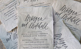 The perfect collaboration! Handmarbled and letterpress printed by De Milo Design Studio & Letterpress. Design by Lovestruck Events. Handmade paper by Fabulous Fancy Pants. One color letterpress printed on handmarbled and handmade paper. Average cost for 100 invitations, Envelopes, RSVP and RSVP envelopes, $3,000. Please contact De Milo for a quote specific to your needs.