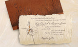 Two color letterpress plus hand orange tinting printed on 4.7.5" handmade Perennial Paper. Average cost for 100 invitations, Envelopes, RSVP and RSVP envelopes, $1,700. Please contact De Milo for a quote specific to your needs.