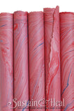 Magenta base sheet. Red and pink with light and dark blue highlights. Sometimes the blues take on a lavender hue. Text weight works well for folding, wrapping, envelope liners and much more. For applications needing a thicker 110lb cardstock weight select Cover Stock.