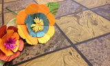 Dress up any concrete floor with marble paper tiles. The jute fiber is strong and takes a a lot of wear. Pictured here is De Milo's National Stationery Show booth after three full days of heavy traffic. Use the heavier cover weight marble, spike tape (like duct tape but skinnier and comes in a variety of colors), and don’t forget to wear knee pads while taping your floor.